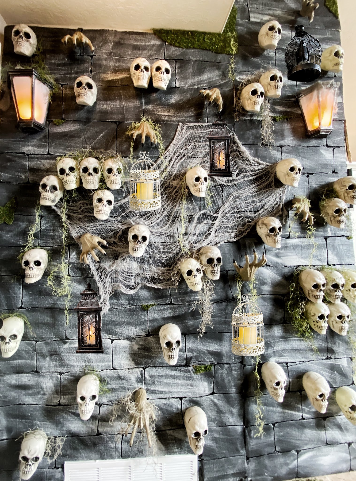 I also had some moss that I had purchased to make my own fairy garden houses. I glued those on to random spots and cracks and corners and I love the texture they gave! I grabbed some creepy cloth I had laying around and stretched it out till it was perfect to fit around some of the skulls. Throughout the years I will add more and more but I am pretty happy with how it's turned out for this year. What would YOU put on your wall?